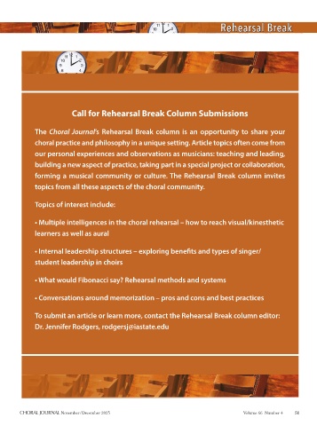 To submit an article or learn more, contact the Rehearsal Break column editor: